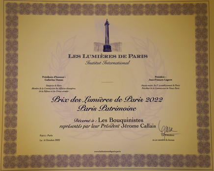 Le "Prix Paris Patrimoine” a été décerné aux bouquinistes de Paris représentés par le Président de l’association culturelle des bouquinistes de Paris Jérôme CALLAIS. Le savoir-faire des bouquinistes de Paris a été récemment inscrit à l'inventaire du patrimoine culturel immatériel de la France, aux côtés de la gastronomie et des métiers d'art. Le lauréat a été présenté par Olivier de TILIÈRE (Vice-président des Lumières de Paris - Institut International, Président du Comité de France) et s'est vu remettre le prix par Fabienne AMIACH (Journaliste, Vice-présidente de Soleil d’Enfance).